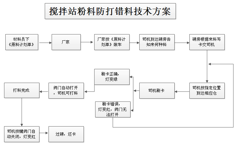 由于生产线和原材料的品种越来越多,料仓打错的可能性也越来,料仓打错往往给企业带来的确是严重的生产事故,严重的可能导致巨额的赔款。我司深入了解搅拌站的打料流程,并针对开发出粉料仓防打错系统。粉料仓防打错系统操作简单,不会增加磅房工作人员和司机的工作量即可实现,详细方案及操作流程如下: