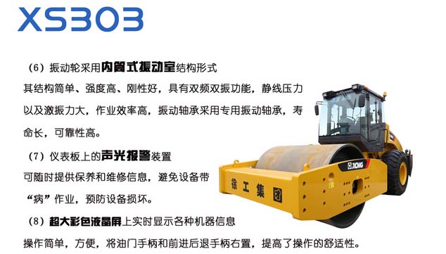 XS303型自行式振动压路机为超重型振动压路机,主要适用于各种材料的基础层、次基础层及填方的压实作业,是高等级公路、机场、港口、堤坝及工业建筑工地的理想压实设备。